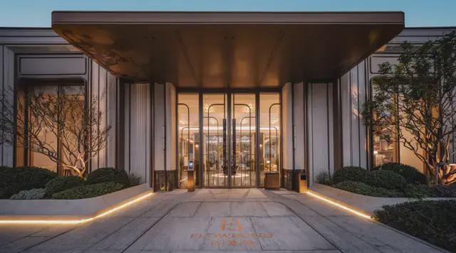 连入户大堂、架空层、风雨连廊也做到「超前点映」,大量使用了月光米黄、范思哲黑等全球奢石,将建筑美学展现得淋漓尽致。