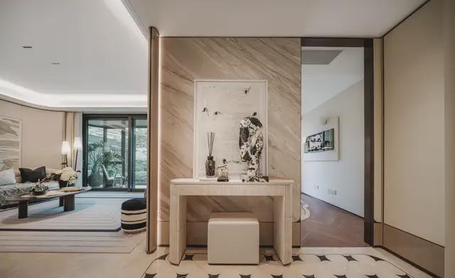 另一方面是「审美与表达」的浑然一体,全屋透露出高雅的克制感,玄关以皮质包覆消磨冰冷感,地面铺设石材纹理自然。