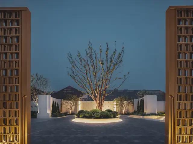 未来社区入口化身「艺术殿堂」,以繁花为视觉焦点,搭配流体曲面墙体,让仪式感与艺术感在空间流淌。