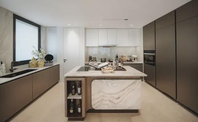 中西双厨「U型动线厨房」非常吸睛,定制级岛台兼具备餐和吧台作用,将奢华感和实用性拉满。