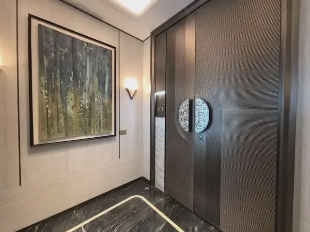 入户第一眼「铸铝子母门」尽显奢华,搭配精致的贝母门把手,细看泛着细腻光泽,顶豪审美一下子就体现出来。