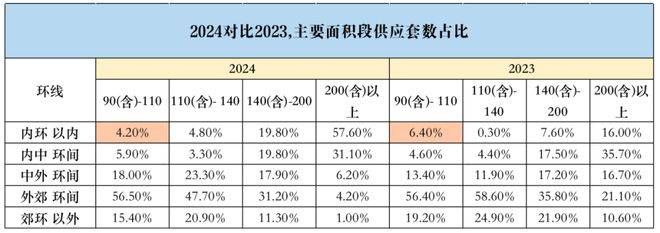 同时,内环内的小户型供应进一步收缩,从23年的6.4%下降到24年的4.2%。随着 70/90 政策的结束,未来内环内的入门面积段将来到120㎡!