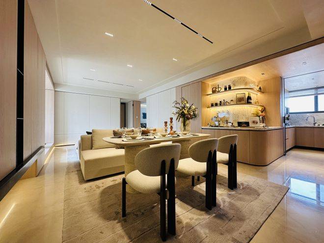 客厅主卧双开间朝南,带大面积阳台和飘窗,尺度感丝毫不虚。客厅餐一体化设计,公区尺度阔绰,厨房外接工作阳台,明厨明卫,通透性能良好。